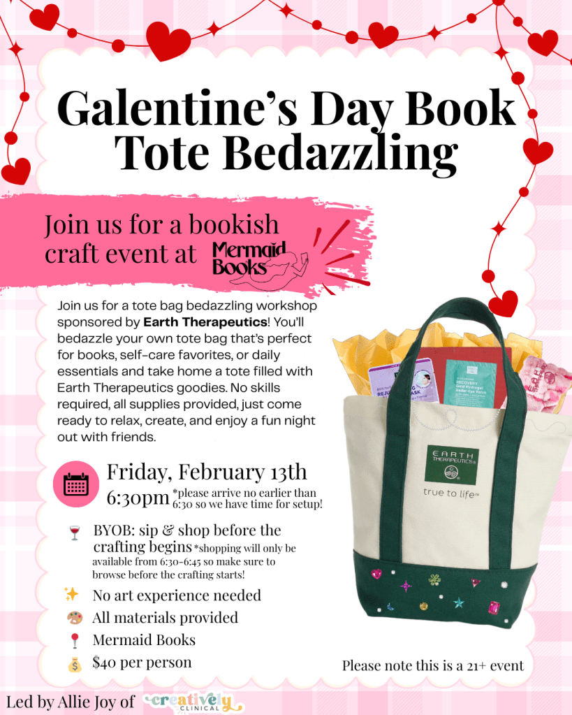 After a brief hiatus, we’re back! Learn how to bedazzle a book! No crafting experience needed, just bring your creativity. You’re free to bring any book you please, but this month, to give class a Valentine’s-season spin, we’ll have special Valentine’s-themed sparkles on hand. (Please note that you must bring your own book to bedazzle or buy one at Mermaid Books to use during the craft event.)